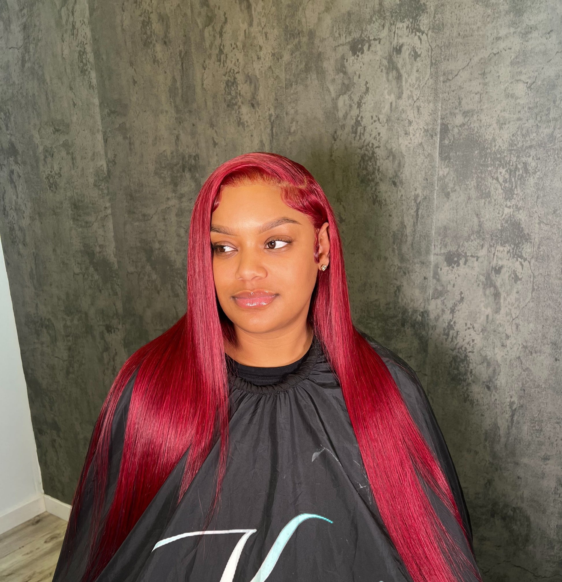 This custom red straight wig is 26 inches long and features a pre-plucked design, making it easy to wear right out of the box. It also includes a 13x4 frontal for a natural-looking hairline.